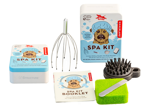Fifi and Fido need a “treat yourself day” too, and owners can provide that with the Kikkerland dog spa kit (K-ET2662). The graphic tin includes a wellness booklet, mini body massager, hairbrush, nail file and lint sponge, all designed to help a pooch relax.