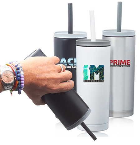 Take your client’s next promo tumbler to another level with this eye-catching laser-engraved model (LESST20) that’s both durable and lightweight. It’s powder-coated with a splash-free lid that prevents drips and spills. Use with hot or cold beverages; rushservice.com