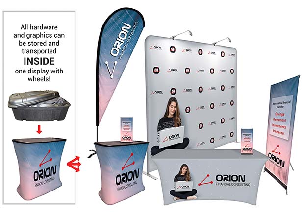 Convenience is at hand with this 8’ Journey SEG double-sided display kit (254872). Designed for effortless setup and portability, it has a foldable steel-aluminum frame and crisp full-color/full-bleed graphics on polyester knit.