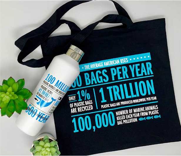 The savvy marketing includes self-promotions centered on a custom-printed reusable bag. Based on a design by Axis graphic designer Jon Porcasi, the bag features eco-focused facts that the Axis team shares with clients. “We often pair it with a custom printed water bottle with an eco message about not using plastic single-use water bottles,” Landorf said.