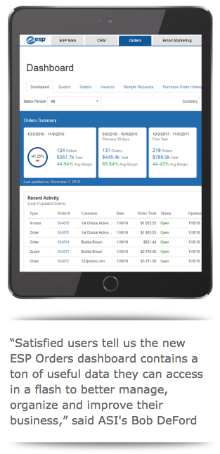 “ASI is always looking to provide streamlined features that make it easier for distributors to track their success,” said Bob DeFord, ASI’s senior vice president of distributor sales and marketing. “Satisfied users tell us the new ESP Orders dashboard contains a ton of useful data they can access in a flash to better manage, organize and improve their business.”