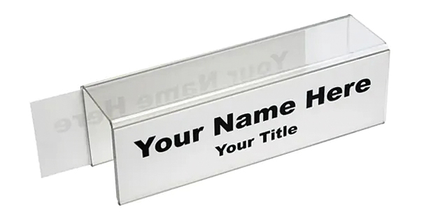 This 4” x 6” acrylic nameplate sits snugly on a 2” cubicle wall. Accommodates standard printer paper.