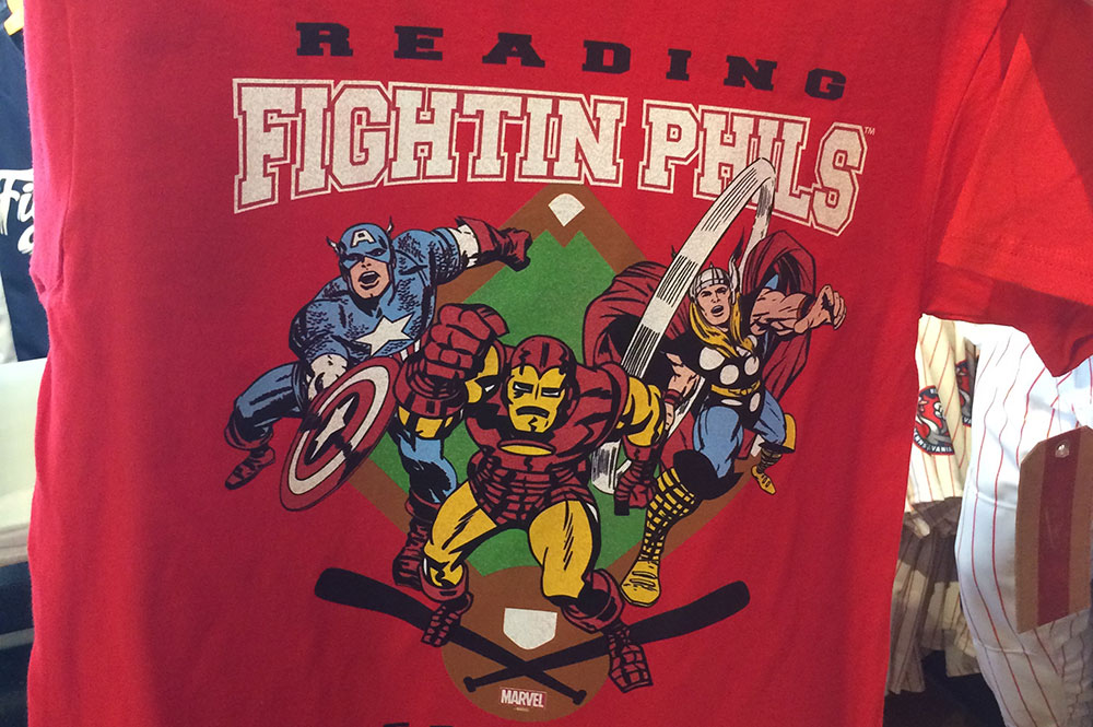 One fan checking out the superhero garb is Kim Bennett of from Pottstown, PA. She’s deciding on shirts for her grandkids in Indianapolis. “When they come to visit, we go to games together,” she says. “They like meeting the players and mascots, and watching the Crazy Hot Dog Vendor throw hot dogs into the stands between innings. They’ve been to minor league games out in Indiana, but they say it’s so much fun here.”