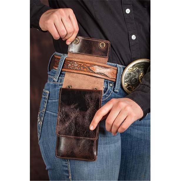 Users don’t have to worry about losing a mobile device from a back pocket with this wearable phone case made of leather and canvas. It has a clasp closure and attaches to any belt or purse.